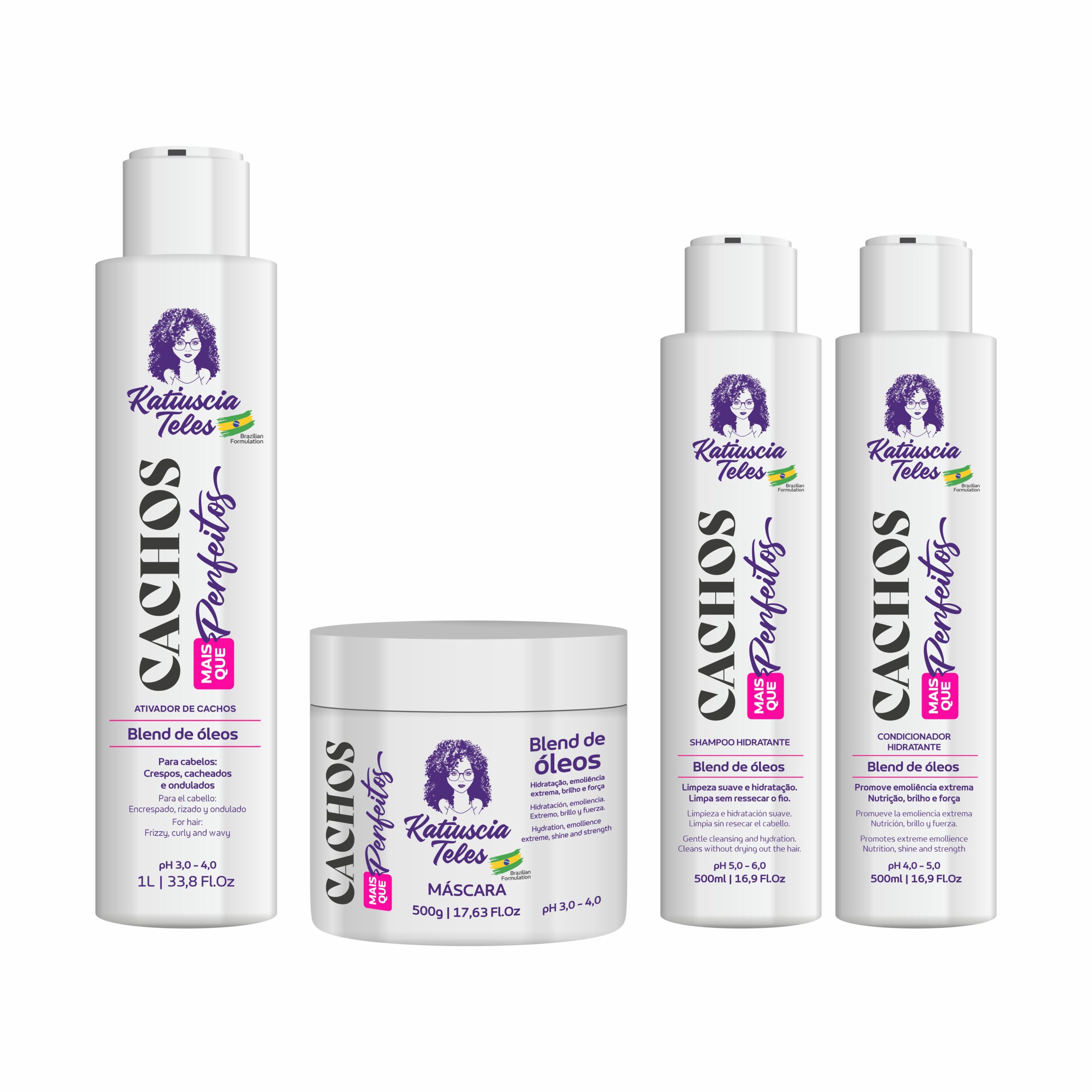 Shampoo Blend 5 Óleos – Cachos + que perfeitos: A linha Cachos + que Perfeitos da Katiuscia Teles foi desenvolvida com os ativos Manteiga de Karité, Abacate, Argan, Carnaúba, Coco, e outros que juntos potencializam a formulação com uma efetiva capacidade de hidratação. Contém vitaminas A e E que funcionam como antioxidantes naturais. Proporciona ação emoliente, melhorando a textura e aparência dos fios. O Shampoo Hidratante Blend 5 óleos limpa delicadamente couro cabeludo, doando perfume suave.
