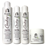 O Kit Karité Cachos + que perfeitos, conta com 1 Shampoo (500ml), 1 Condicionador (500ml), 1 Máscara hidratante (500gr) e 1 Ativador (1L).  Combinados, garantem emoliência extrema nutrição, brilho e força. Além de definir e modelar os cachos.